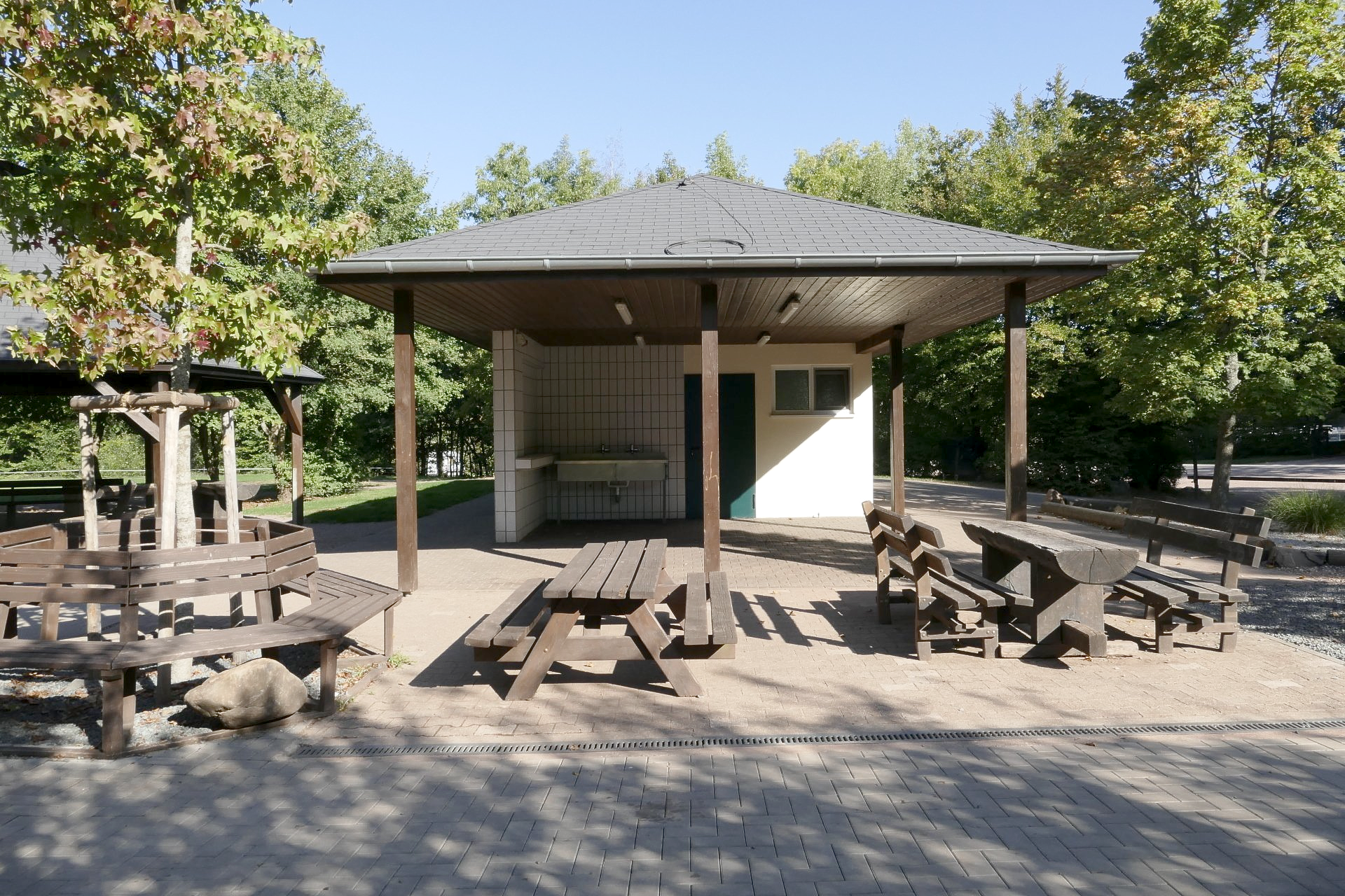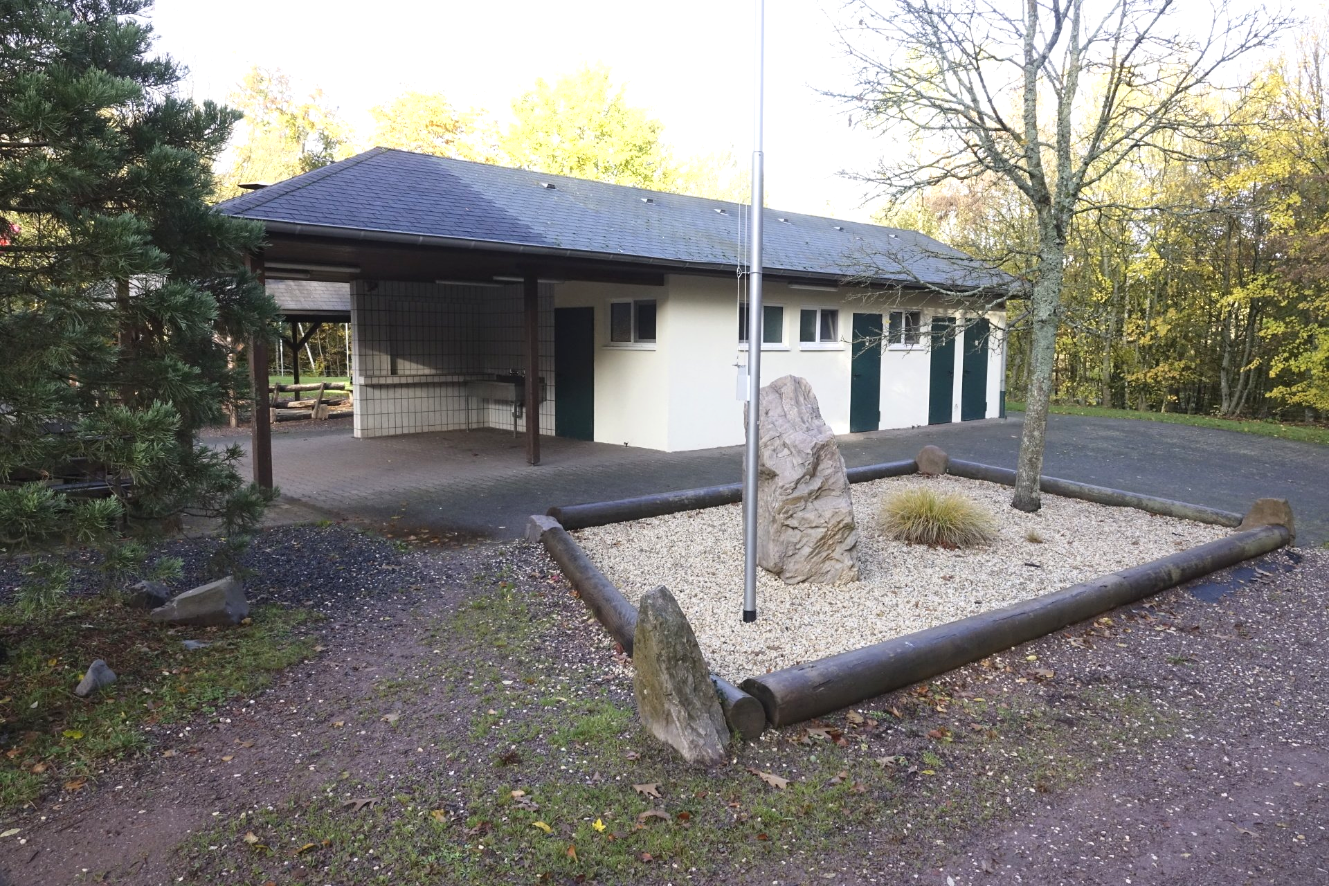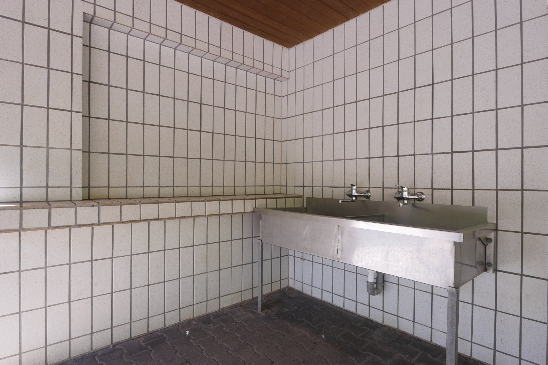Sanitärgebäude mit Duschen, Toiletten und einer Behindertentoilette, Küchenraum mit überdachter Vorfläche,